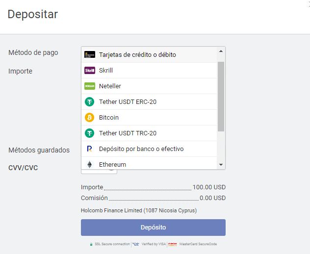 - Paso 4: en el momento que ya desees operar con dinero real, debes depositar con criptomonedas, transferencia bancaria u otro método de pago permitido, que varían de acuerdo a tu país de residencia.