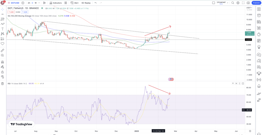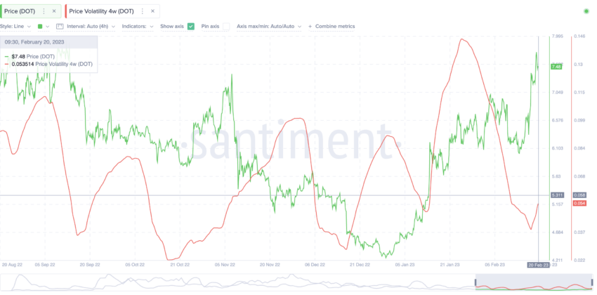 La capitalización y el volumen de trading de DOT muestran datos interesantes. A mediados de febrero de 2023, el precio experimentó un repunte que apenas duró una semana, junto con un volumen creciente. Se esperaba que la volatilidad disminuyera en favor de la cotización, aunque el mercado ha forzado una corrección significativa.