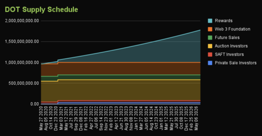 El modelo económico de Polkadot parece ser bastante transparente, aunque no tanto en lo que se refiere al mecanismo de las recompensas para los stakers. En cualquier caso, analizando el cuadro de la oferta, se observa que la sección de recompensas ha experimentado un crecimiento significativo.