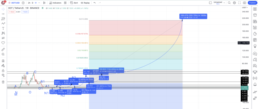 Aplicando Fibonacci al mínimo de 2025 y al máximo de 2026, obtenemos un precio para 2030 sobre los 213 dólares. La condición principal es que supere la línea de los 55 dólares (ATH de 2021) antes de 2028.