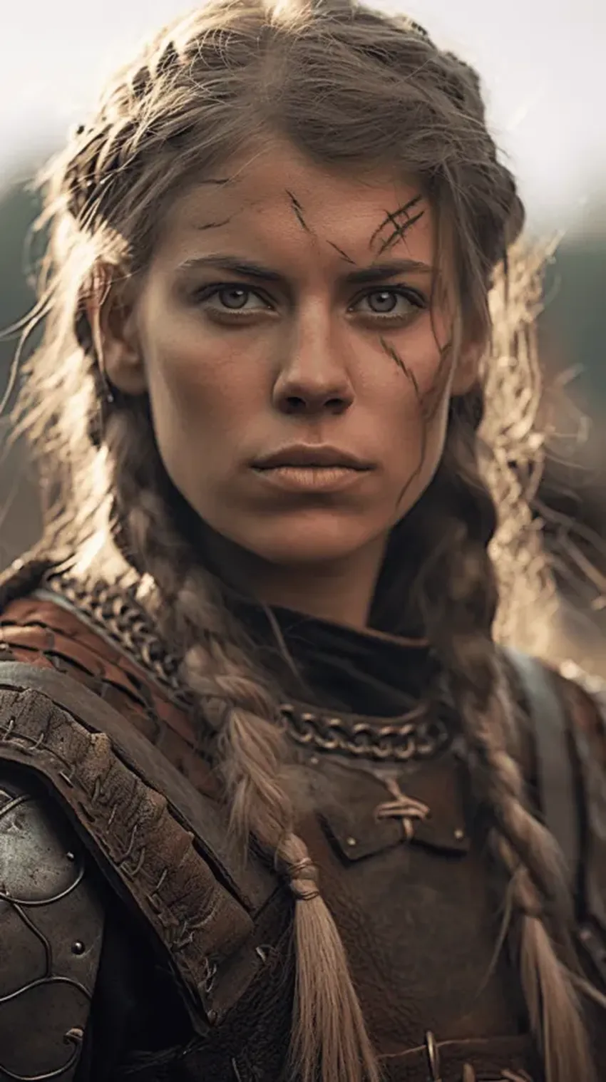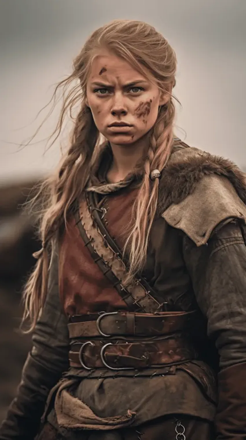 Female Viking warrior, age 24, in traditional dress, standing amidst a battlefield, strong and fierce. Shot in portrait style with depth of field effect, tilt blur, and a shutter speed of 1/1000, F/22. Pay special attention to the lighting, which should be a mix of natural and moody cinematic lighting, creating shadows and contrasts on her face. Aim for a hyper-realistic, super-detailed image. –ar 9:16 –s 750 –q 2 –v 5