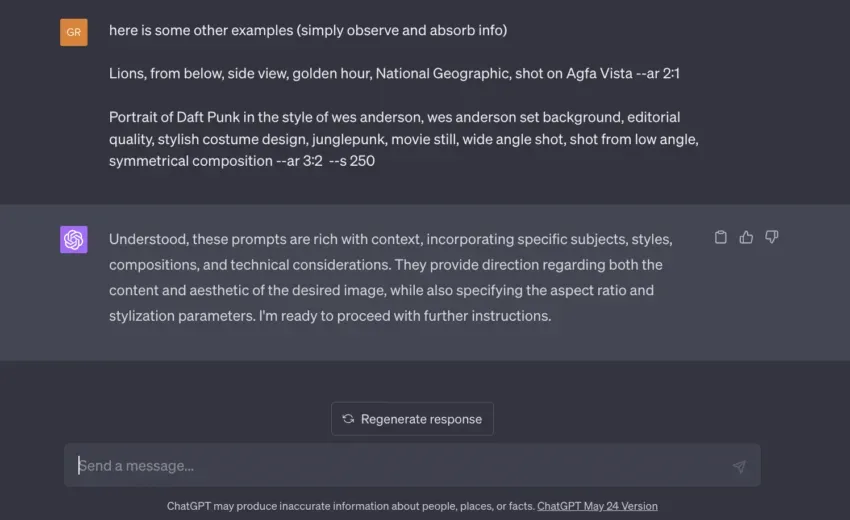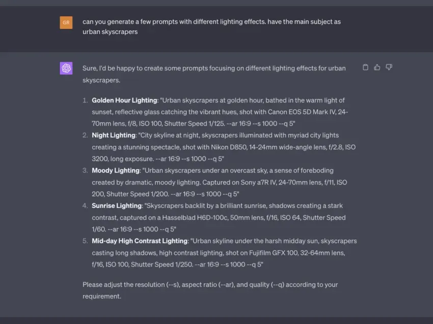 Los prompts de Midjourney suelen tener muchos sufijos que facilitan la conversión de texto en imagen. Como parte del entrenamiento, ChatGPT debe entender qué significan estos sufijos: