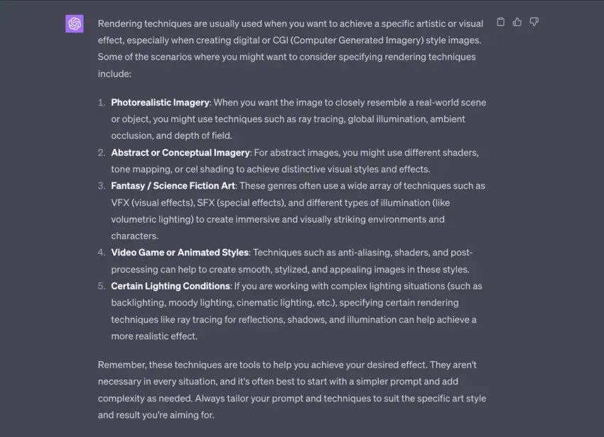 Además de mejorar el prompt propuesto, ChatGPT realizó algunos comentarios interesantes sobre el uso de algunos efectos de renderización, demostrando de nuevo la capacidad de aprendizaje del modelo.