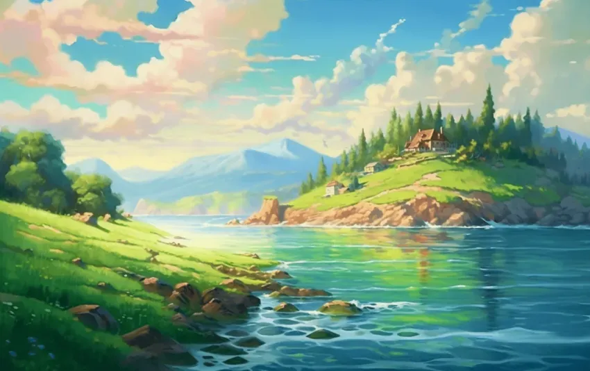 Green hills meet clear blue waters, sunny sky. Painted in Romantic style, ethereal light. No human elements. –no plants –ar 16:10 –s 500 –q 5