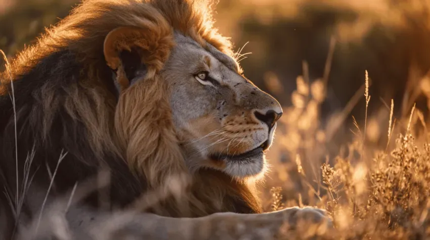 Close-up of a majestic lion in the African savannah, mane blowing in the wind, a pride of lions resting in the backdrop, shot during golden hour. Shot on a Canon EOS-1D X Mark III, 600mm f/4 lens, Shutter Speed 1/2000, F/6.3, ISO 800, Depth of Field, with a touch of film grain to add a classic documentary feel. The sun setting in the background, creating an atmospheric backlighting effect on the lion. –ar 16:9 –s 100 –q 5