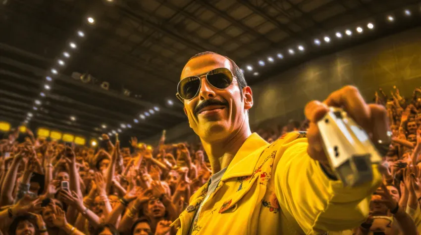 Freddie Mercury on stage at a concert, taking a selfie with thousands of ecstatic fans in the background, dynamic pose, charismatic expression, vibrant stage lights reflecting off his aviator sunglasses, shot on Canon EOS 5D, 50mm lens, Depth of Field, Shutter Speed 1/200, F/1.8, White Balance 5500k, Stage Lighting, Backlight, Dramatic Lighting, Concert lights, Photo-realistic, detailed audience, clear foreground, film grain effect, 4K –ar 16:9 –s 500 –quality 5.