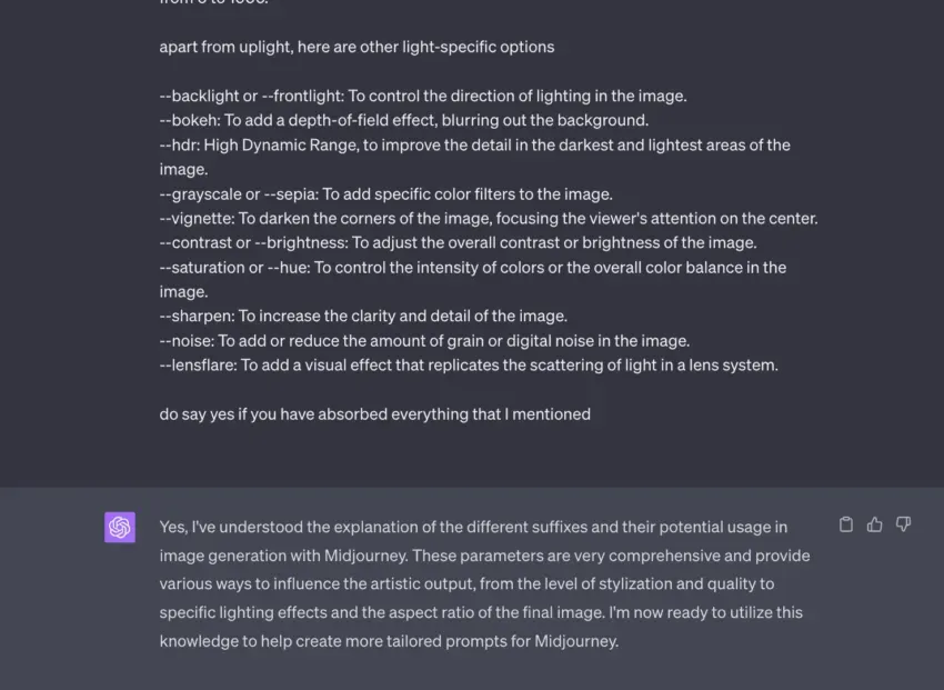 Estos sufijos se ofrecieron a ChatGPT durante el entrenamiento, que los procesó respondiendo afirmativamente. En tu entrenamiento, puedes añadir otros sufijos disponibles en la lista de comandos de Midjourney, que puedes copiar y pegar directamente.