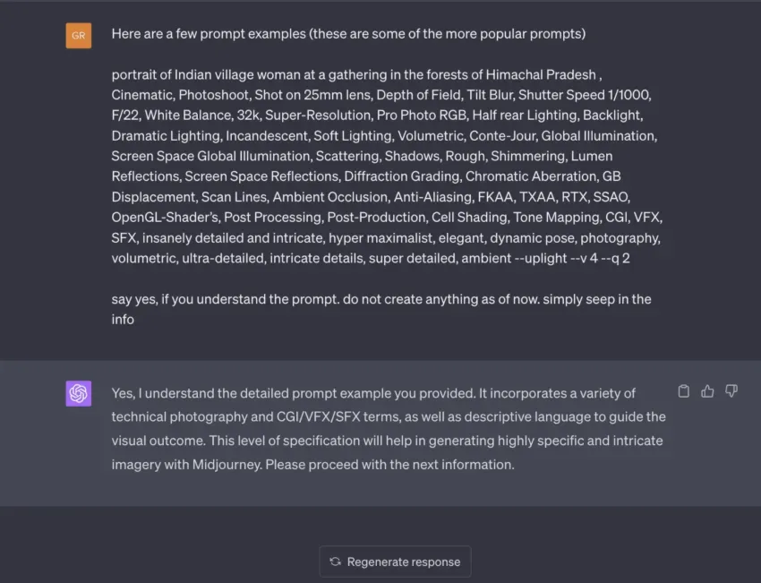 Usado como generador de prompts para midjourney ChatGPT puede ayudar en el entrenamiento del modelo. Es posible preguntarle qué variables conocidas se relacionan con un prompt dado. Probamos con una entrada de texto muy detallada. ChatGPT entendió correctamente todo. Incluso criticó la extensión del prompt: