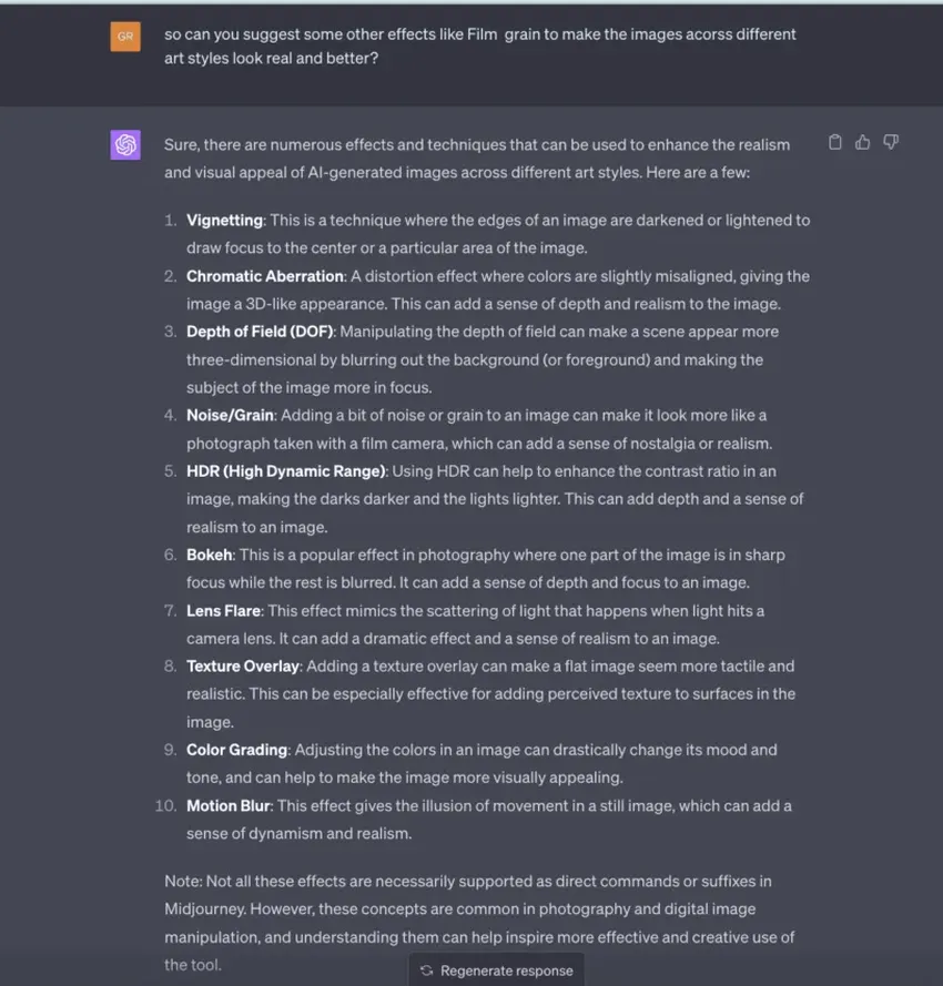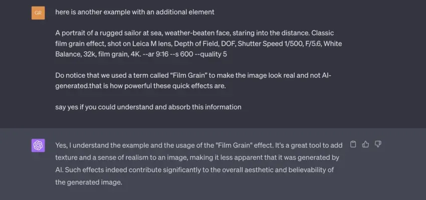 Lo interesante del entrenamiento, es que se pueden sugerir más efectos basándose en los existentes. Por ejemplo, le pedimos a ChatGPT que incluyera términos similares al granulado en sus prompts.