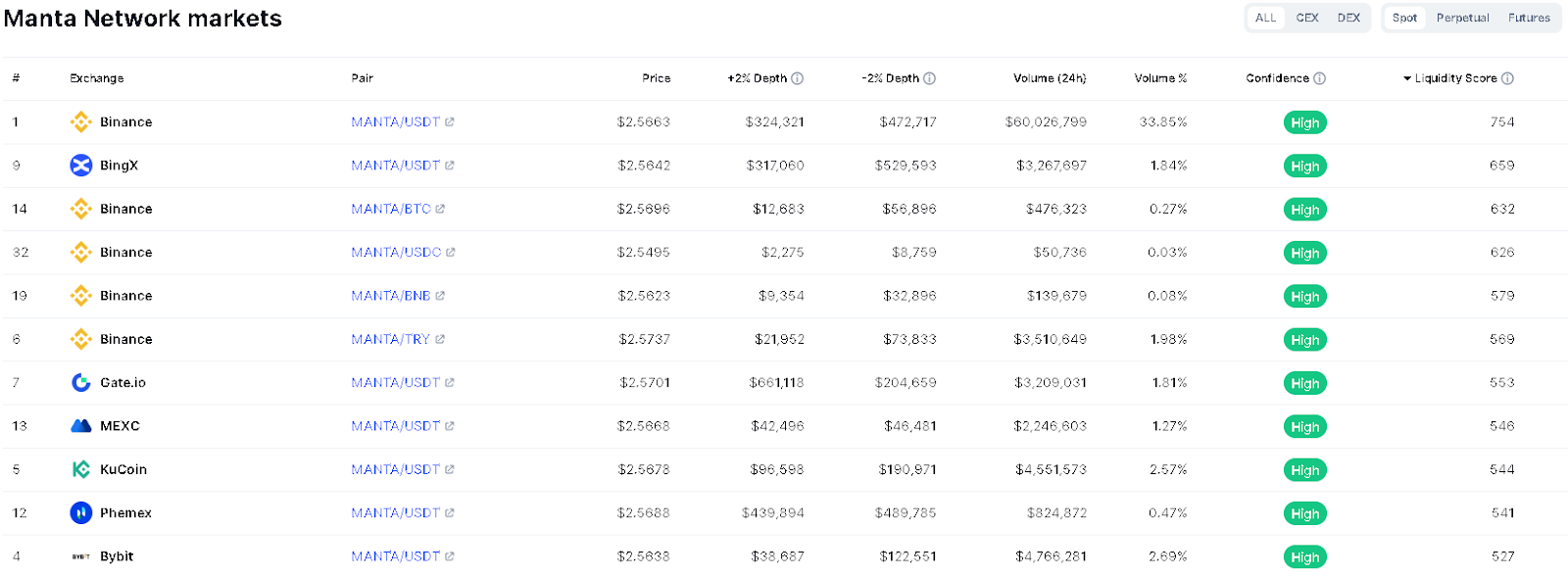 MANTA está disponible en una amplia lista de plataformas, incluyendo exchanges populares como Binance, KuCoin y Bybit. La mayoría de pares enfrentan el token contra USDT, aunque es posible hacer trading con Bitcoin, BNB (en Binance) e incluso euros (en Bitvavo).