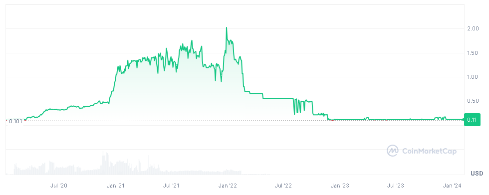 Según CoinGecko, el mínimo histórico se sitúa en torno a los 0.009 dólares (marzo de 2021). Esta cifra implica una revalorización del 1530% en tres años hasta los 15 centavos actuales (7 de febrero de 2023), aunque se encuentra un 97% por debajo del ATH.