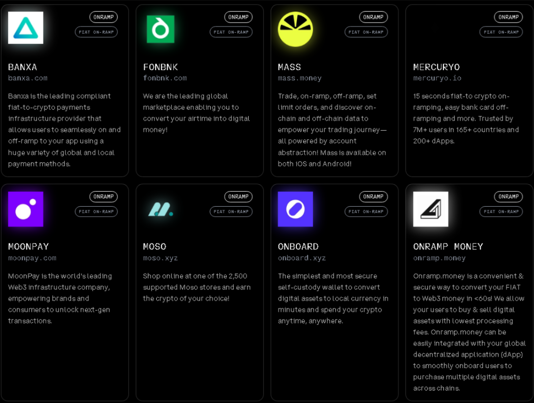Base es compatible con una docena de rampas que permiten pasar cripto a fiat. Veremos algunas populares, como Banca o MoonPay, pero también otras opciones menos conocidas, como Transak y Mercuryo. Por supuesto, Wallet Connect también se encuentra en la lista de ecosistemas y aplicaciones interoperables con Base.