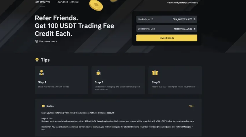 Participar en el programa de referidos es fácil, optando a descuentos de hasta 100 USDT en comisiones y tarifas.