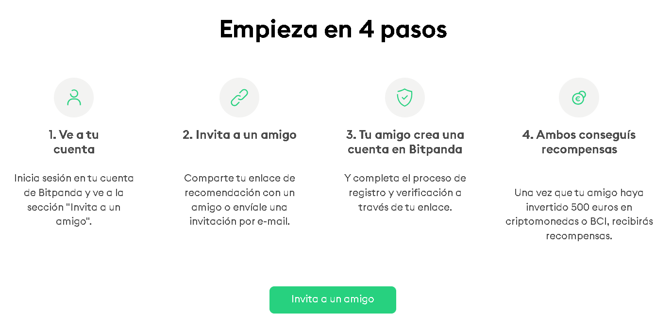 Bitpanda cuenta con un programa de referidos con recompensas de hasta 100 euros para ambas partes, siempre y cuando el nuevo usuario alcance un volumen de trading de 500 euros en criptomonedas o índices BCI. La plataforma también ofrece ventajas para holders de su token nativo (BEST): Bitpanda Club y BEST Rewards.
