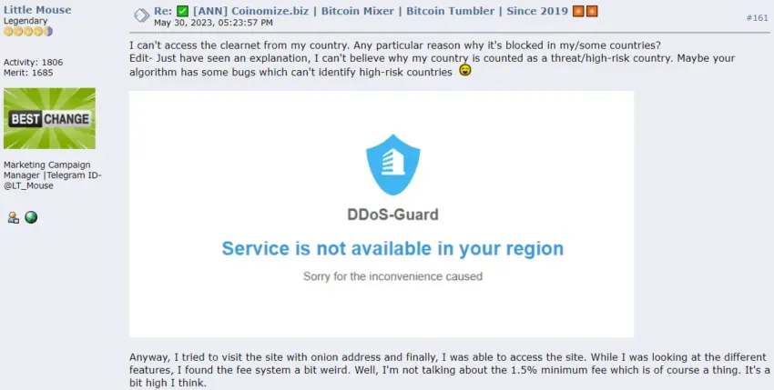 Las comisiones no salvan a Coinomize cuando se trata de comparaciones. Sus comisiones son bastante elevadas si las enfrentamos a las de mixers como Bitcoinmix, con una comisión de servicio del 0.3% (al igual que Wasabi Wallet) y una tarifa por transacción de 0.0001 BTC por dirección.
