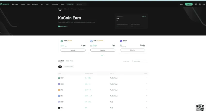 Como muchos otros CEX, KuCoin cuenta con un programa de generación de ingresos pasivos, pero la sección “Earn” de KuCoin no se centra en el staking. Cuenta con sus propios productos, tales como Protective Earn, Dual Investment y Twin-Twin.