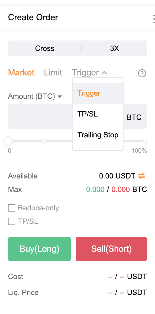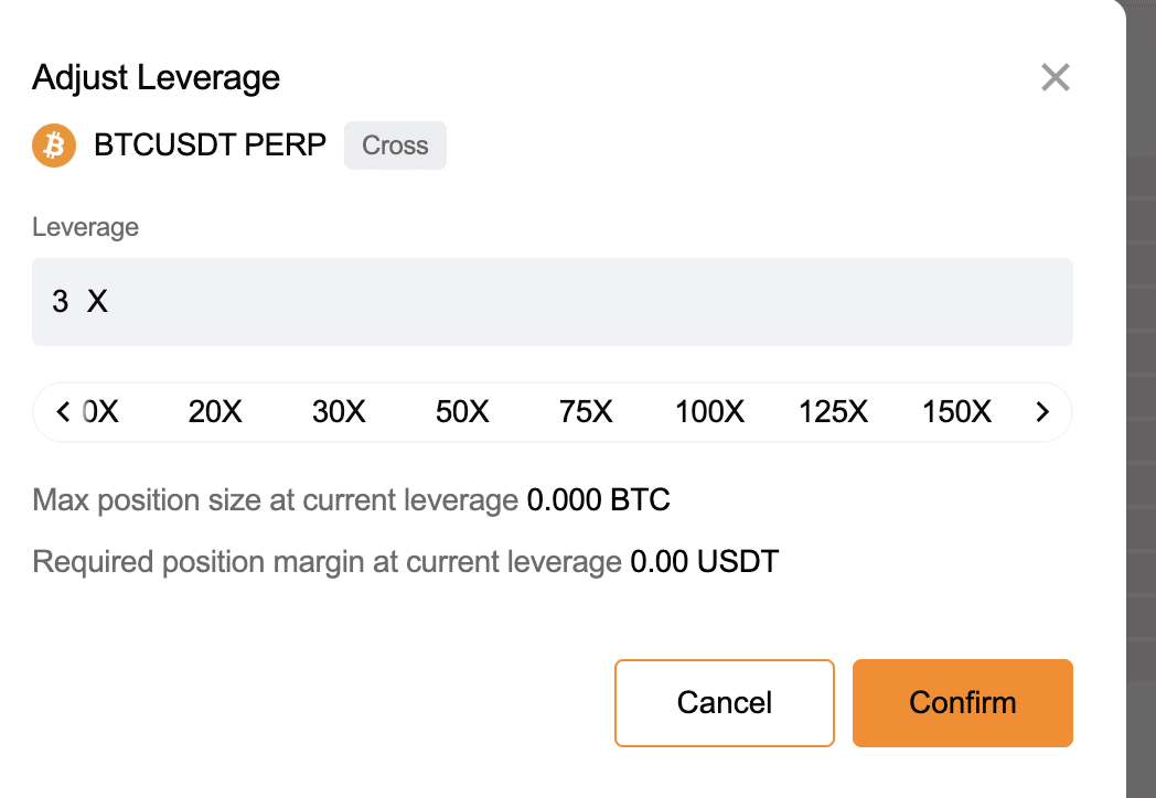 - El primer paso aquí es elegir el margen. Si desea que el mismo apalancamiento cubra todas sus operaciones de futuros/al contado, puede optar por un margen cruzado. De lo contrario, puede elegir un margen aislado, que puede ser de hasta 150x para pares específicos.