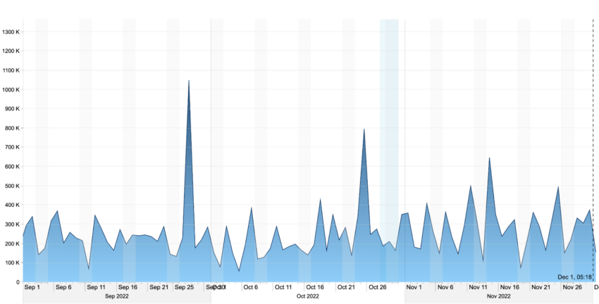 El pico máximo de actividad de la red se registró el 25 de septiembre de 2022. El precio del token VET se encontraba en un rango. Ni siquiera el volumen de trading era significativo a finales de septiembre.