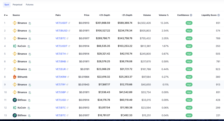 El token VET está disponible en múltiples plataformas y exchanges, tales como Binance, KuCoin y Bitfinex. El par más popular es VET/USDT, con un volumen de trading considerable y un grado de liquidez aceptable.