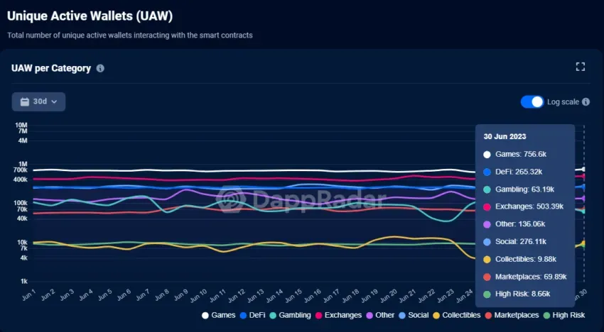 Por esta misma razón, el potencial de crecimiento del proyecto es enorme. Según DappRadar, en junio de 2023 hay más de 2 millones de wallets interactuando de alguna forma con smart contracts.