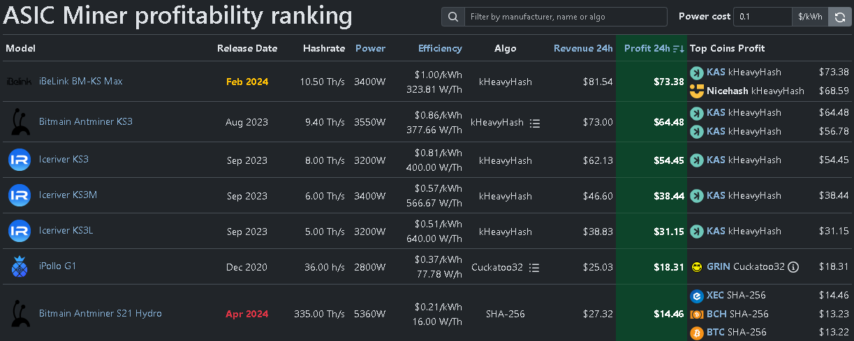 Dependiendo del hardware elegido para realizar el cálculo, obtendremos una serie de resultados. En el caso de usar mineros ASIC, la lista de equipos muestra información detallada, incluyendo el modelo, el hash rate, el consumo, el algoritmo, los beneficios diarios y la rentabilidad.