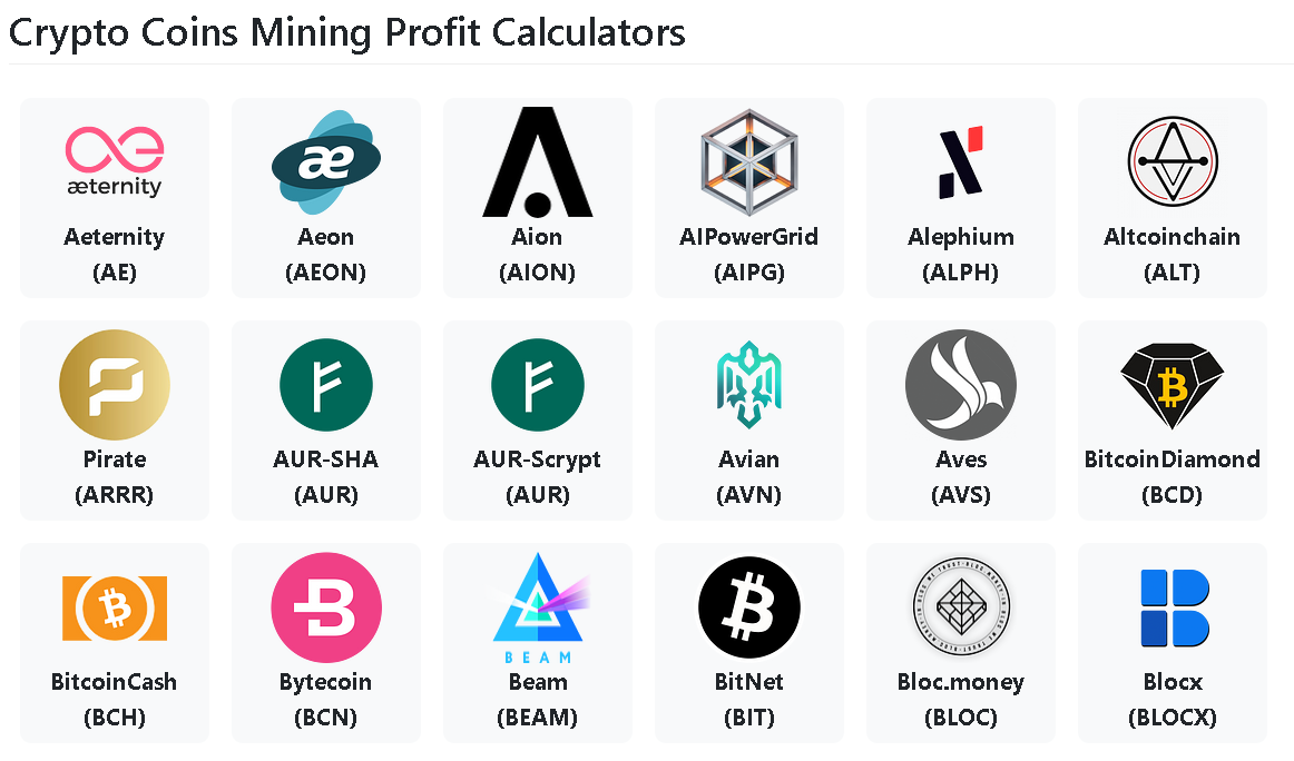 En la sección “Coins”, encontramos una amplia lista de tokens con calculadoras más completas. Estas incluyen variables como el hash rate, la potencia, las recompensas, la dificultad de minado, las comisiones y el precio del activo. Los resultados se muestran en forma de beneficios mensuales, semanales, diarios y por hora.