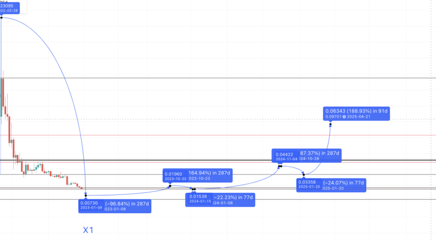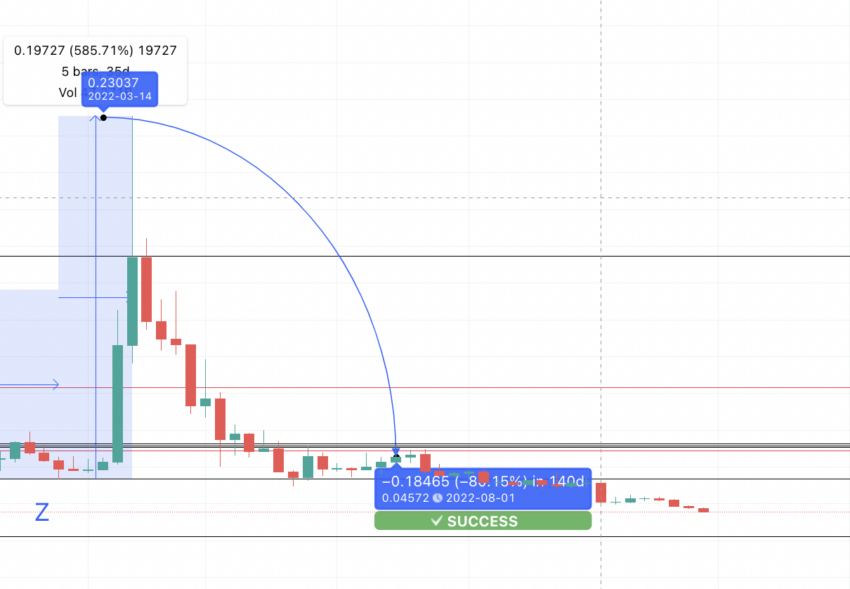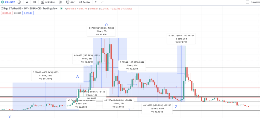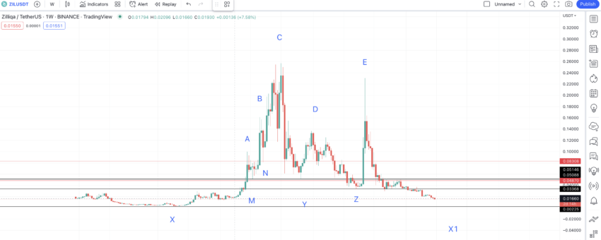 Los datos indican que el precio de X1 se encontraría en torno a los 0.0457 dólares, una línea que ZIL rompió hace tiempo. Si tenemos en cuenta la primera parte del patrón, podríamos aplicar una distancia de 287 días, con un cambio de -96.70 puntos porcentuales (entre los puntos A y X). Pero, si asumimos la simetría del patrón, la distancia entre los puntos E y Z1 permitiría ubicar el mínimo en torno a los 0.00730 dólares.