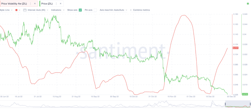 La volatilidad mensual alcanzó un pico a finales de noviembre de 2022, justo cuando el precio comenzó a caer de nuevo. La siguiente gráfica muestra que la volatilidad parece estar aumentando. Se trata de otro dato más para ser precavidos a corto plazo: históricamente, el precio de ZIL y su volatilidad han mantenido una relación inversa.