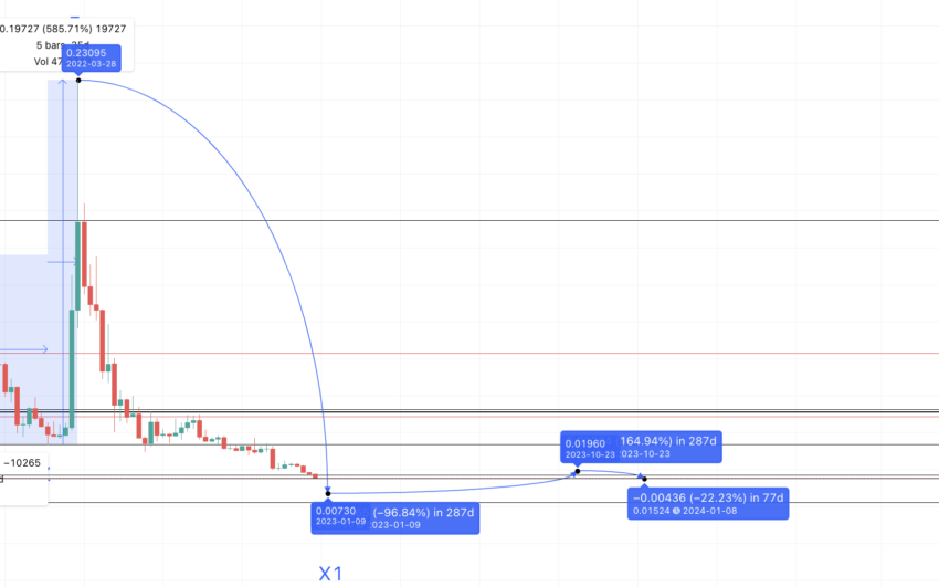 Es momento de ubicar el siguiente mínimo a partir del punto A1. Usando la media de máximos a mínimos de 72 días y un cambio del 63.72%, encontrando un fuerte soporte sobre la línea de los 0.01533 dólares a comienzos de 2024.