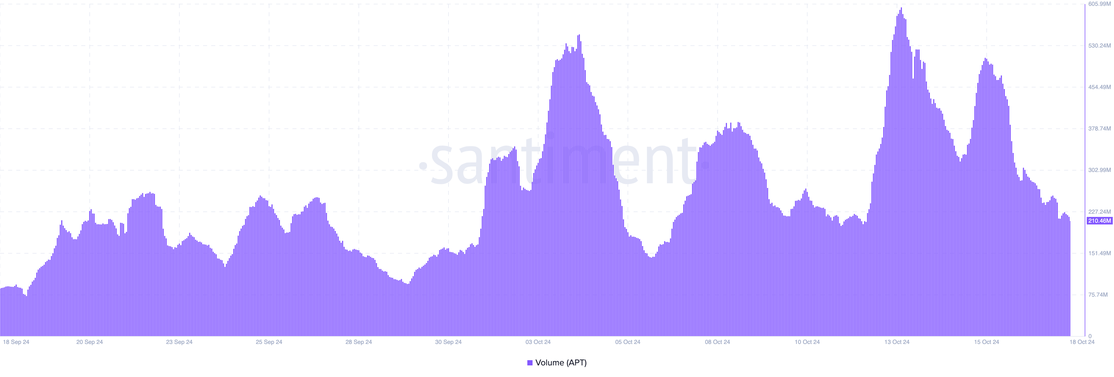 SponsoredAdemás, el volumen de trading del proyecto parece haber jugado un papel significativo en la reciente caída. Por ejemplo, el volumen de Aptos se disparó a 600 millones de dólares el 13 de octubre, coincidiendo con el rally de precios anterior, lo que indica un creciente interés en el token en ese momento.