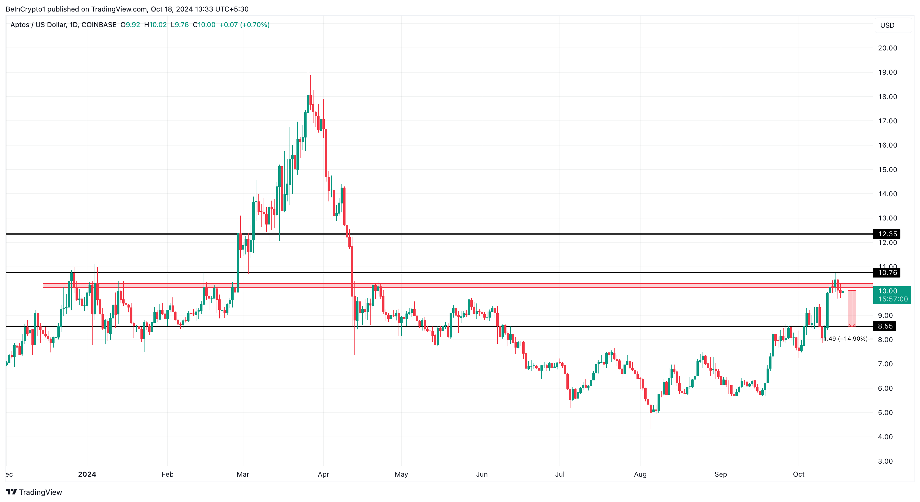 Según el gráfico diario, el precio de Aptos se encuentra actualmente en una región que históricamente lo retrae. Desde 2023, cada vez que APT se sitúa por encima de la marca de 10 dólares, le resulta difícil realizar una ruptura.