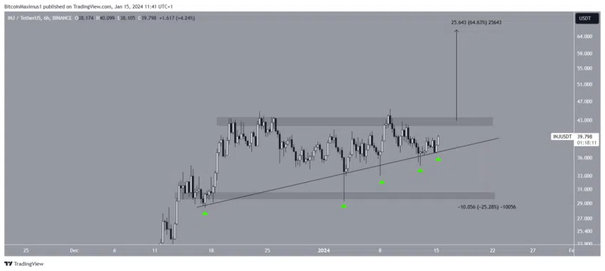 Una ruptura que recorra toda la longitud del patrón llevaría al INJ hasta los 66 dólares, 65% más que el precio actual. A pesar de esta predicción alcista del precio, el cierre por debajo de la línea de tendencia de soporte ascendente del triángulo invalidará la perspectiva positiva. Entonces, INJ podría caer 25% hasta el soporte más cercano en 30 dólares.
