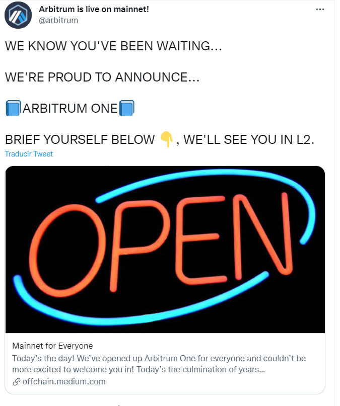 El anuncio fue oficializado el 31 de agosto a través de las redes oficiales de Arbitrum One donde se especifica el lanzamiento y posterior puesta en marcha de la Capa 2 con un informe detallado y específico.