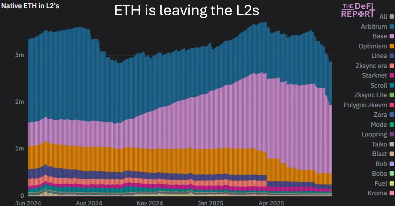 El gráfico de The DeFi Report ilustra claramente esta tendencia, especialmente desde principios de 2025, cuando importantes redes L2 como Optimism y Base han presenciado retiros significativos de ETH. Según los análisis, los precios debilitados de los tokens nativos de Ethereum L2 son un factor crítico.