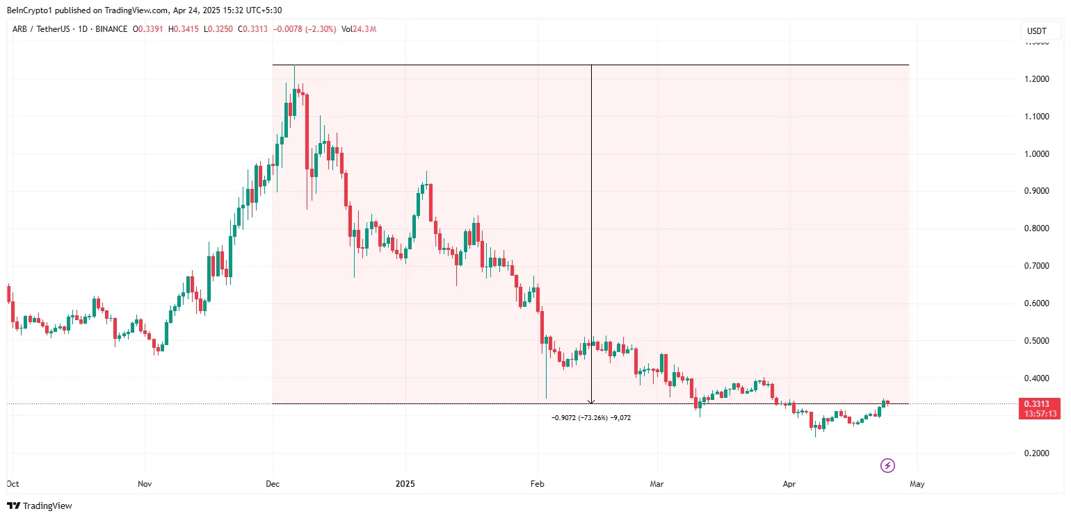 El precio de Arbitrum cayó más del 80% desde su máximo de diciembre de 2024 de 1,2384 dólares, lo que llevó a la red a desarrollar intervenciones para restaurar el valor.