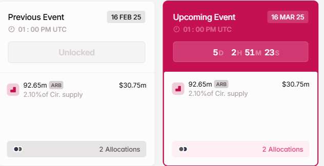 Mientras tanto, este anuncio llega solo días antes del evento de desbloqueo de tokens de Arbitrum. Según datos de Tokenomist, la red Arbitrum desbloqueará 92,65 millones de tokens ARB por un valor de 30.75 millones de dólares según las tasas actuales. Estos tokens constituyen el 2.1% del suministro circulante de ARB.