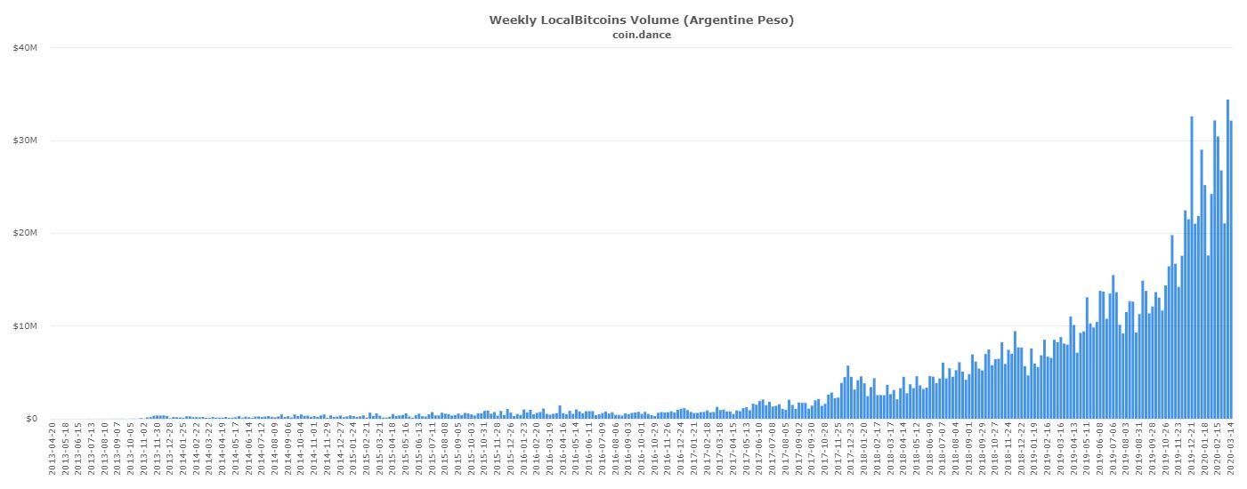 Para empezar, el volumen de intercambio en LocalBitcoins entre el BTC y los pesos argentinos (ARS) volvió a romper su propio récord histórico de diciembre, cuando superó los 32 millones de pesos. Ahora, el pasado 7 de marzo, logró verse una cifra de 34.422.908 ARS, equivalentes a un aproximado de 517.200 USD.