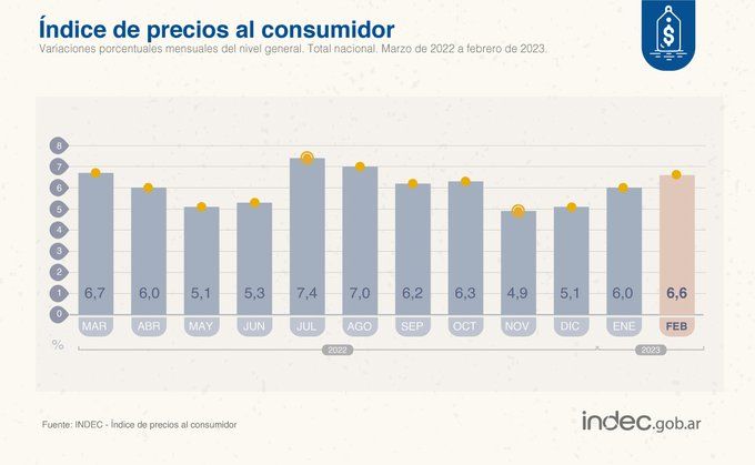 La inflación en Argentina se aceleró al punto de registrar un 6.6% para el mes de febrero. Con este dato, el primer bimestre de 2023 ya marca una variación de precios del 13.1%. La medición interanual es tan preocupante con los datos mensuales: se ubicó en el 102.5%. Entre los aspectos notables del informe presentado por el Instituto de Estadísticas y Censos (INDEC) aparece que por primera vez, en más de treinta años, se supera la barrera del 100%.