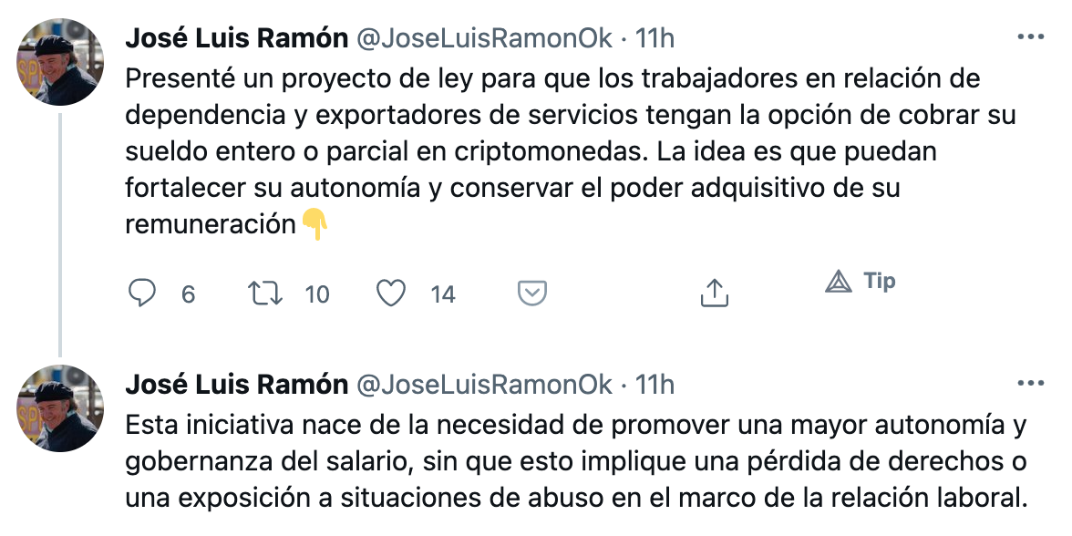 Argentina podría ser el nuevo capítulo de la historia de Bitcoin y las criptomonedas, debido que se ha presentando una propuesta de ley para regularizar la elección del asalariado de recibir su sueldo con Bitcoin u otras criptomonedas en vez del peso argentino. Si esta ley sale adelante los argentinos tendrían la libertad de elegir ser pagados con criptomonedas sin ningún impedimento legal.