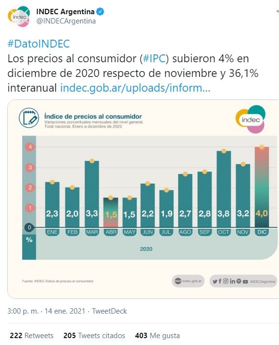 Tomando como referencia lo señalado por el Instituto Nacional de Estadísticas de Argentina (INDEC), el índice de precios al consumidor (IPC) se ubicó en 4% durante el mes diciembre, una cifra que supera en gran magnitud el mínimo de los meses de abril y mayo (1,5 %), cuando la economía estaba prácticamente paralizada por la cuarentena.