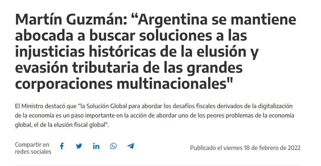 “Coincidimos en la importancia del desarrollo de un marco de reunir la información que garantice el pleno cumplimiento de las obligaciones tributarias (…) Argentina se mantiene abocada a buscar soluciones a las injusticias históricas de la elusión y evasión tributaria de las grandes corporaciones multinacionales”
