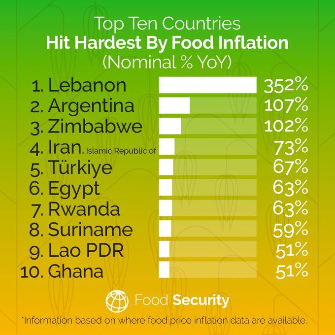 La información revelada por el organismo forma parte de una actualización de su reporte de Seguridad Alimentaria. Se trata de un trabajo realizado entre los meses de enero y abril de 2023, donde la Argentina es el único país latinoamericano que se encuentra en el top ten de las naciones más golpeadas por la inflación de los alimentos, con 107%. De la publicación no participa Venezuela, ya que ese país no cuenta con divulgación de datos oficiales.