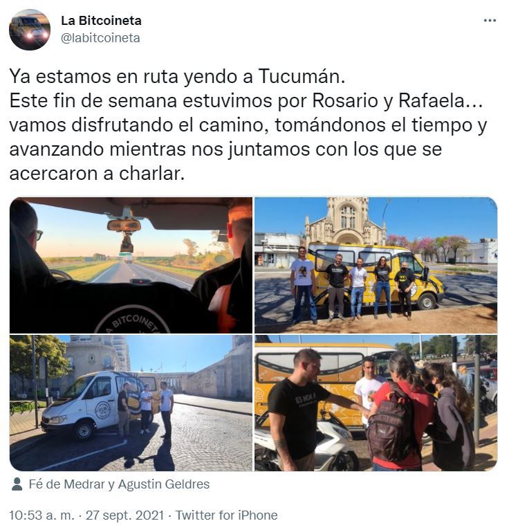 Como parte de una iniciativa conjunta entre Bitcoin Iberoamérica y ONG Bitcoin Argentina, tres de sus integrantes argentinos: Agustín Geldres, Guadalupe Ares y Federico Andragnes, realizan un recorrido desde el sur del continente hasta El Salvador a bordo de una camioneta denominada “Bitcoineta”, en la que harán labor de difusión de la criptomoneda en el camino.
