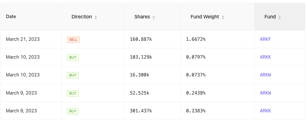 Según los datos propios de ARK, el ETF de ARK (ARKF) vendió alrededor de 160.887.000 acciones COIN, unos 13,5 millones de dólares en el momento de su venta.