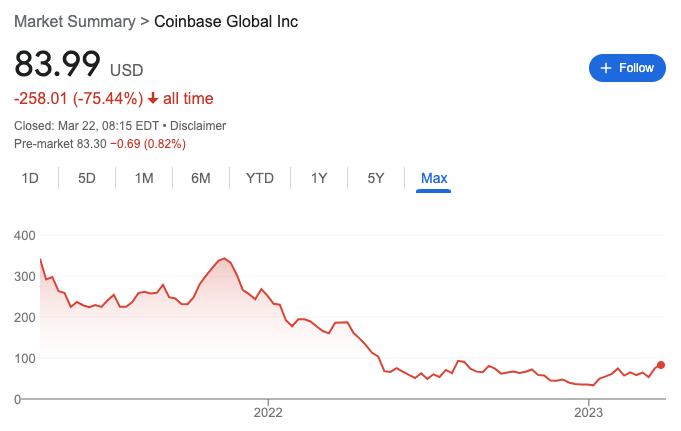 SponsoredDesde la salida de COIN, el precio de la acción ha sufrido con grandes bajadas que a día de hoy aún no ha logrado recuperar.