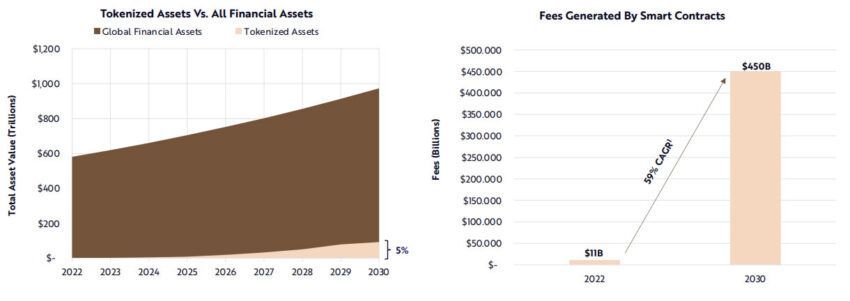 La cifra de 450 mil millones de dólares se obtuvo al predecir un crecimiento de adopción de smart contracts similar al de Internet en su etapa temprana. Si los servicios financieros descentralizados cobraran un tercio de las tarifas de los servicios financieros tradicionales, la industria podría superar los 5 billones de dólares para 2030.