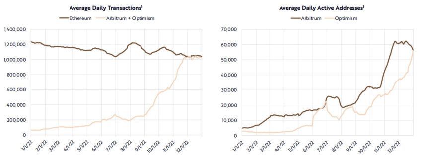 Finalmente, el informe se refirió a las redes de Capa 2. El número de transacciones en las dos principales redes L2, Arbitrum y Optimism, ahora es igual la Capa 1 de Ethereum.