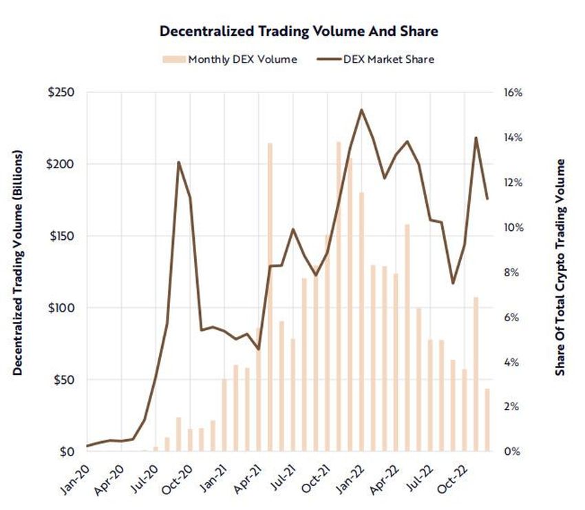 Los investigadores observaron un cambio de paradigma hacia soluciones y exchanges descentralizados basados en contratos inteligentes. Además, las cuotas de mercado de los DEX han aumentado en los últimos tres años: