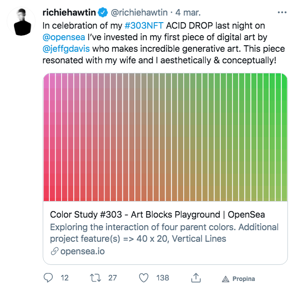 Por su parte Jeff Davis saltaba al podio gracias a un tweet del archiconocido DJ Richie Hawtin. El productor de música, tras lanzar el mismo su propia colección de NFTs, anunció que se había hecho con una pieza de su colección Color Study.