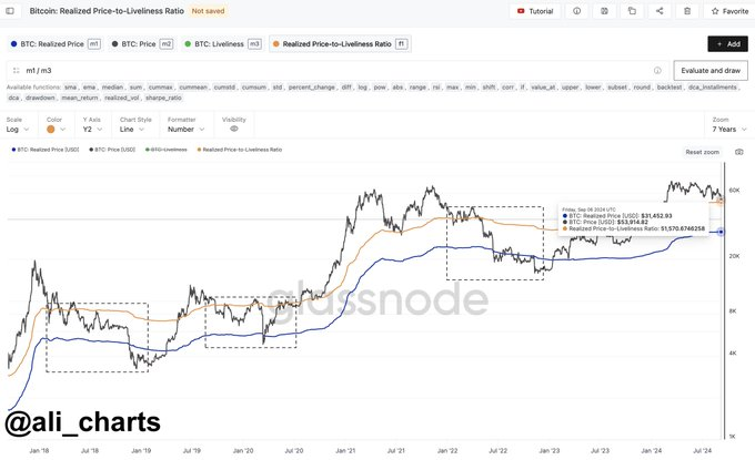 “Históricamente, cuando #Bitcoin cae por debajo del [indicador] Realized Price-to-Liveliness Ratio, ahora en $51.600, a menudo cae aún más hasta su precio realizado, ¡actualmente en $31.500!”, alertó Martínez.